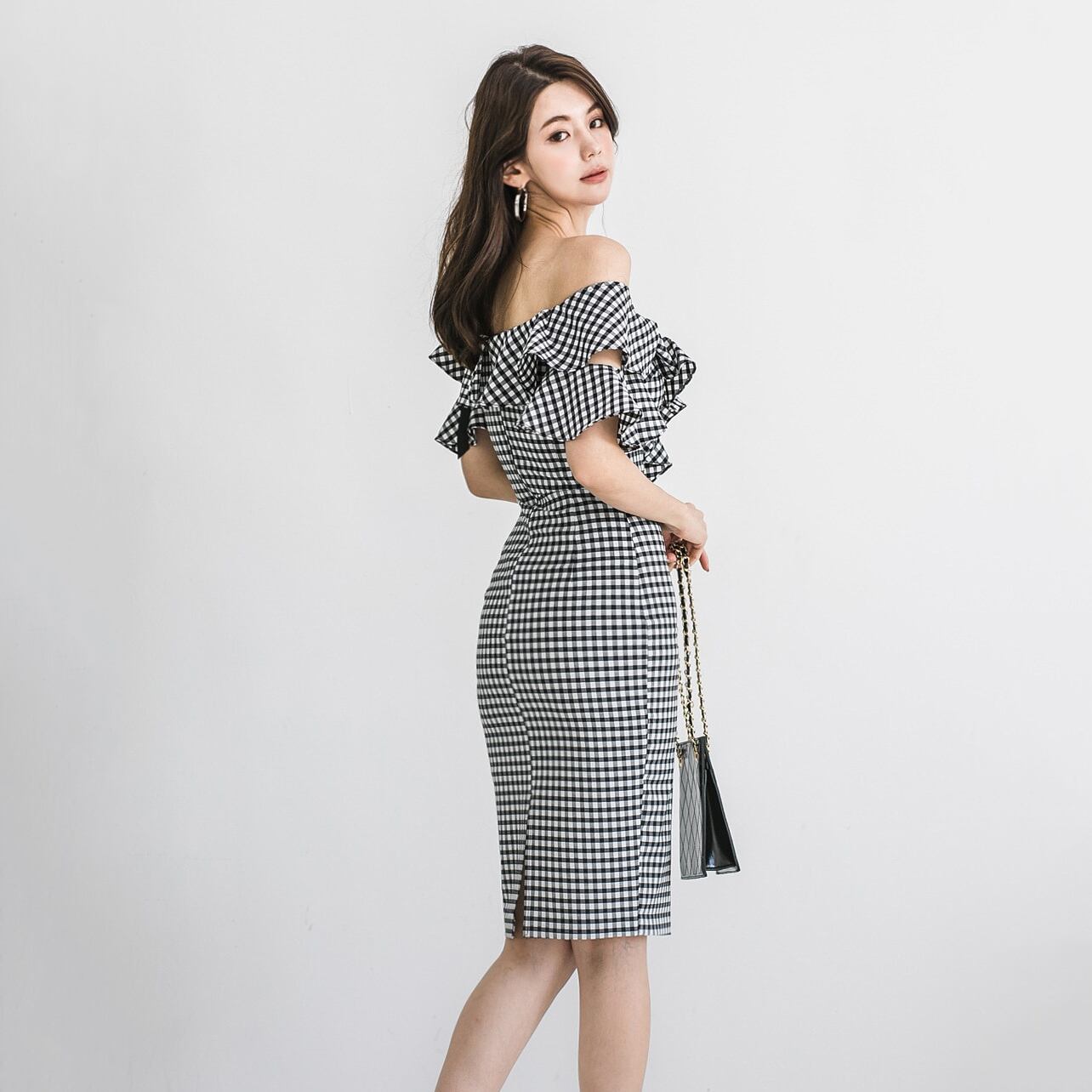 新作 チェック柄 フリル ノーショルダー セクシー ゴージャス 高見え パーティードレス ミニドレス LQE9091BM131