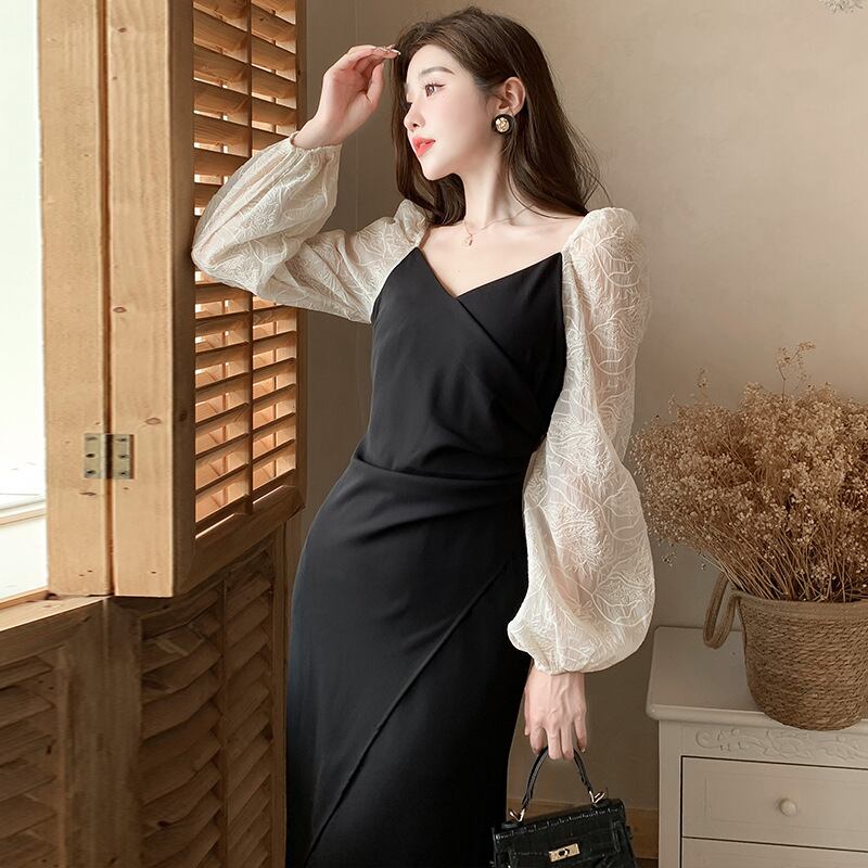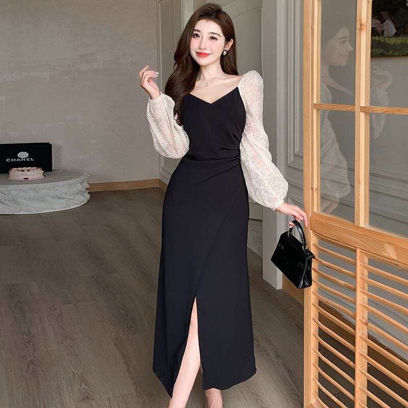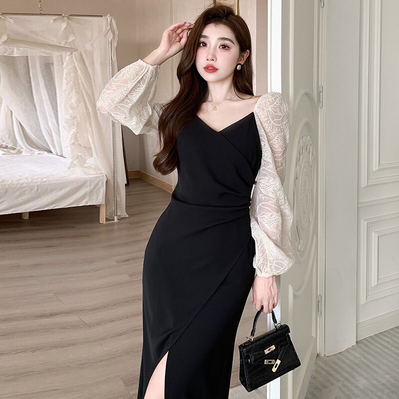 ロングドレス エレガント パフスリーブ 美足効果 気質 袖付き XH2-ZED888971GT441