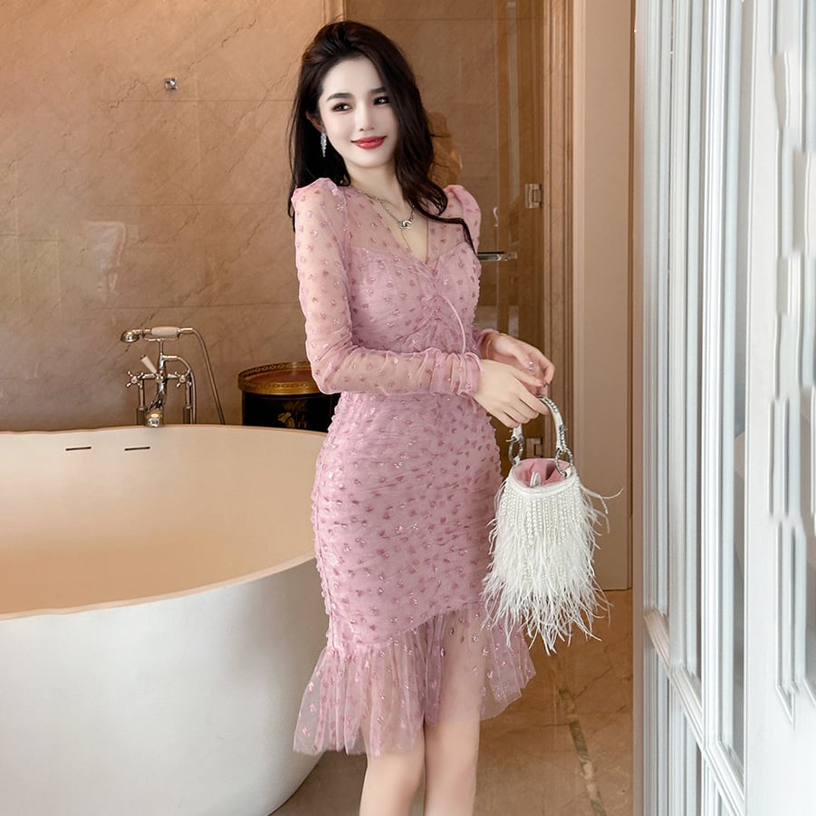 【手作り】ミニドレス 高品質 レース フリーVネック 気質 ハート柄 宴会 XH2-JY9603
