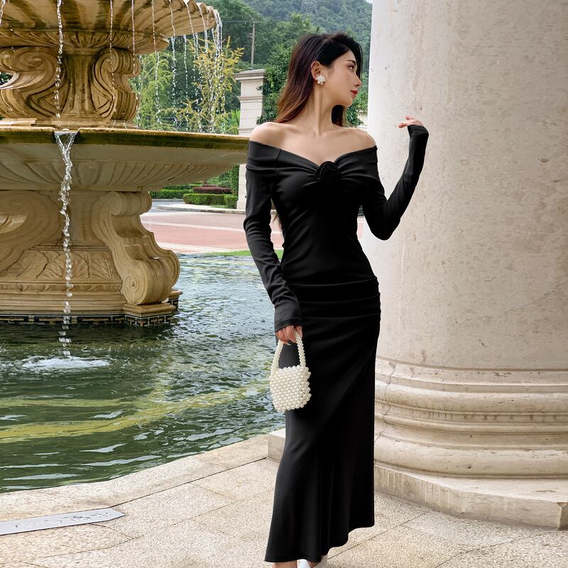 【2色】ロングドレス セクシー オフショルダー 谷間魅せ 指名 フリル 気質 XH2-ZED889648GT347