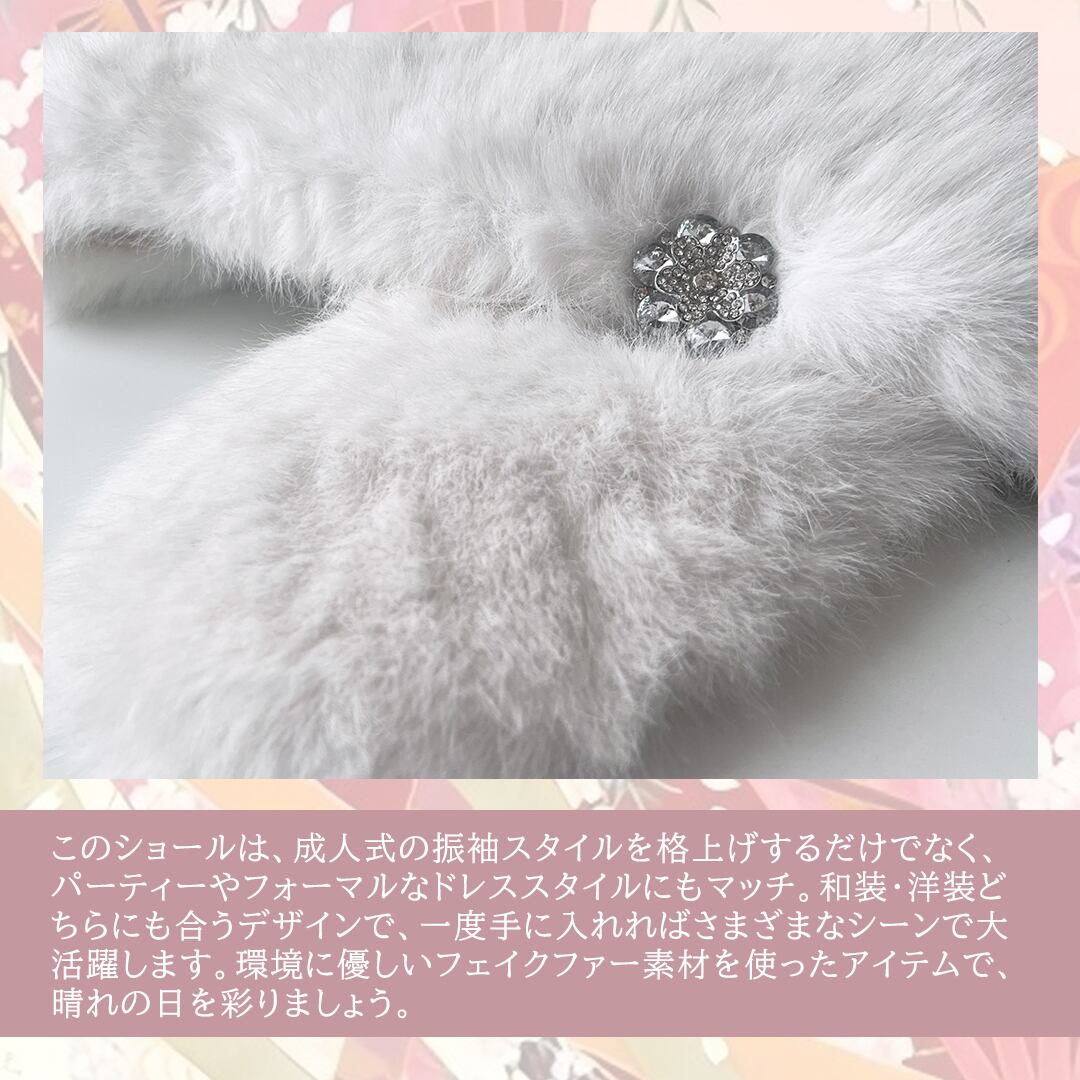 成人式の晴れの日にぴったりの、ふわりとした柔らかさと緻密な毛並みが特徴のフェイクファーショール。